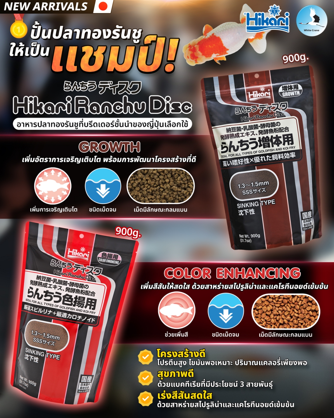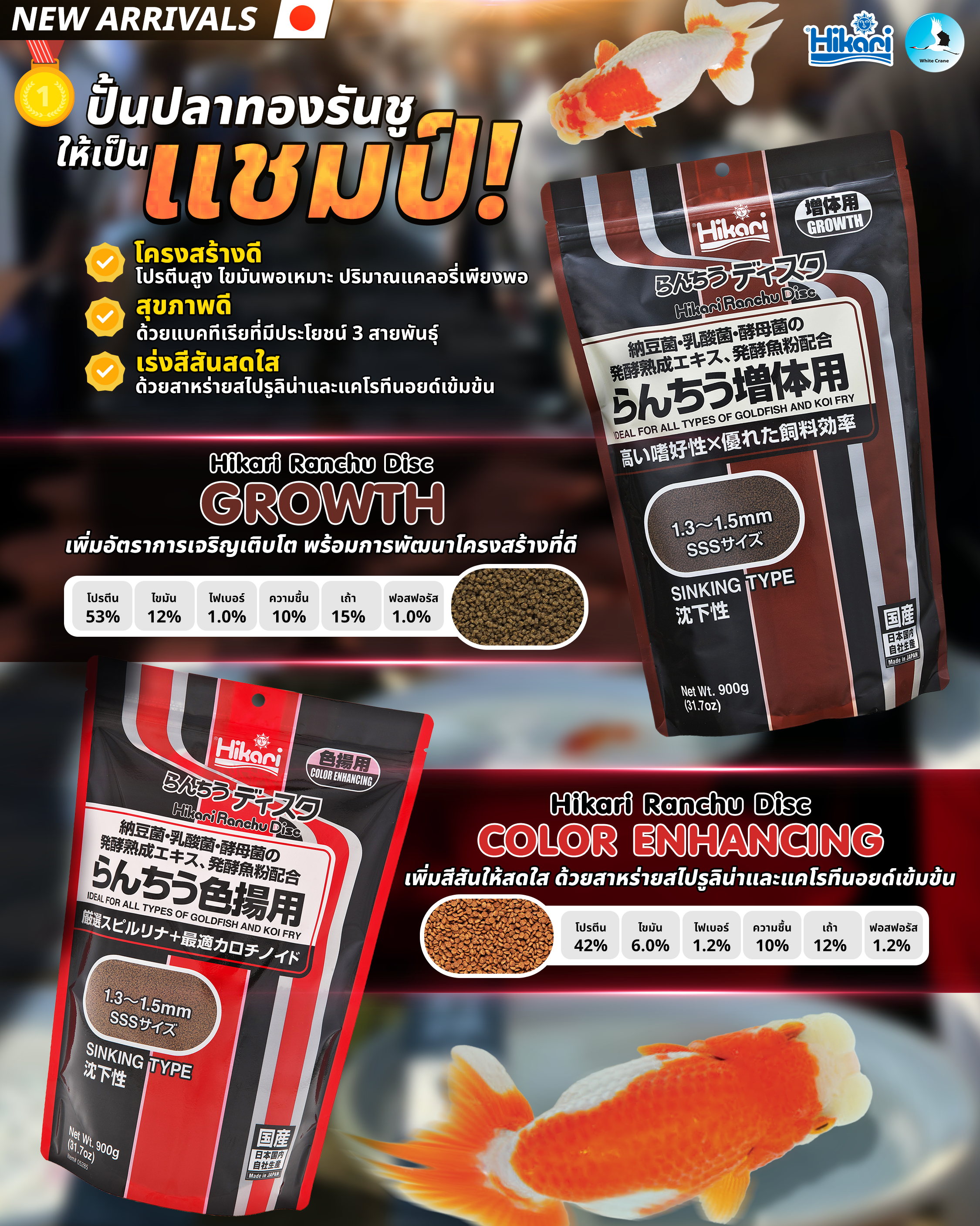 คุณสมบัติอื่นๆที่โดดเด่น โปรตีนสูง ไขมันพอเหมาะ ให้ปริมาณแคลอรี่ที่เพียงพอต่อการเจริญเติบโตและพัฒนาโครงสร้าง (สูตร Growth) เพิ่มสีสันสดใสรวดเร็วทันใจ ด้วยสาหร่าสไปรูลิน่าและแคโรทีนอยด์เข้มข้น (สูตร Color Enhacing) มีกลิ่นหอม ช่วยให้ปลาอยากกินอาหาร มีส่วนผสมของหนอนไหมที่มีโปรตีนสูงและปลาทองรันชูชื่นชอบ ผ่านกระบวนการหมัก โดยการย่อยโปรตีนให้เป็นกรดอะมิโน ทำให้ปลาสามารถดูดซึมสารอาหารไปใช้ได้เต็มที่ เม็ดอาหารมาในรูป Disc หรือเม็ดกลมขนาดเล็ก กินได้ทั้งปลาขนาดเล็กและโตเต็มวัย